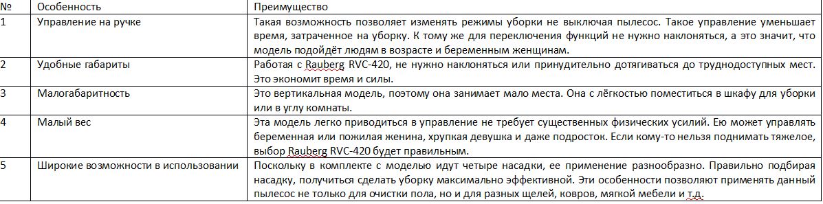 Rauberg RVC-420 имеет много преимуществ перед остальными моделями. Он лёгок в использовании и обслуживании, поэтому пользоваться им приятно.